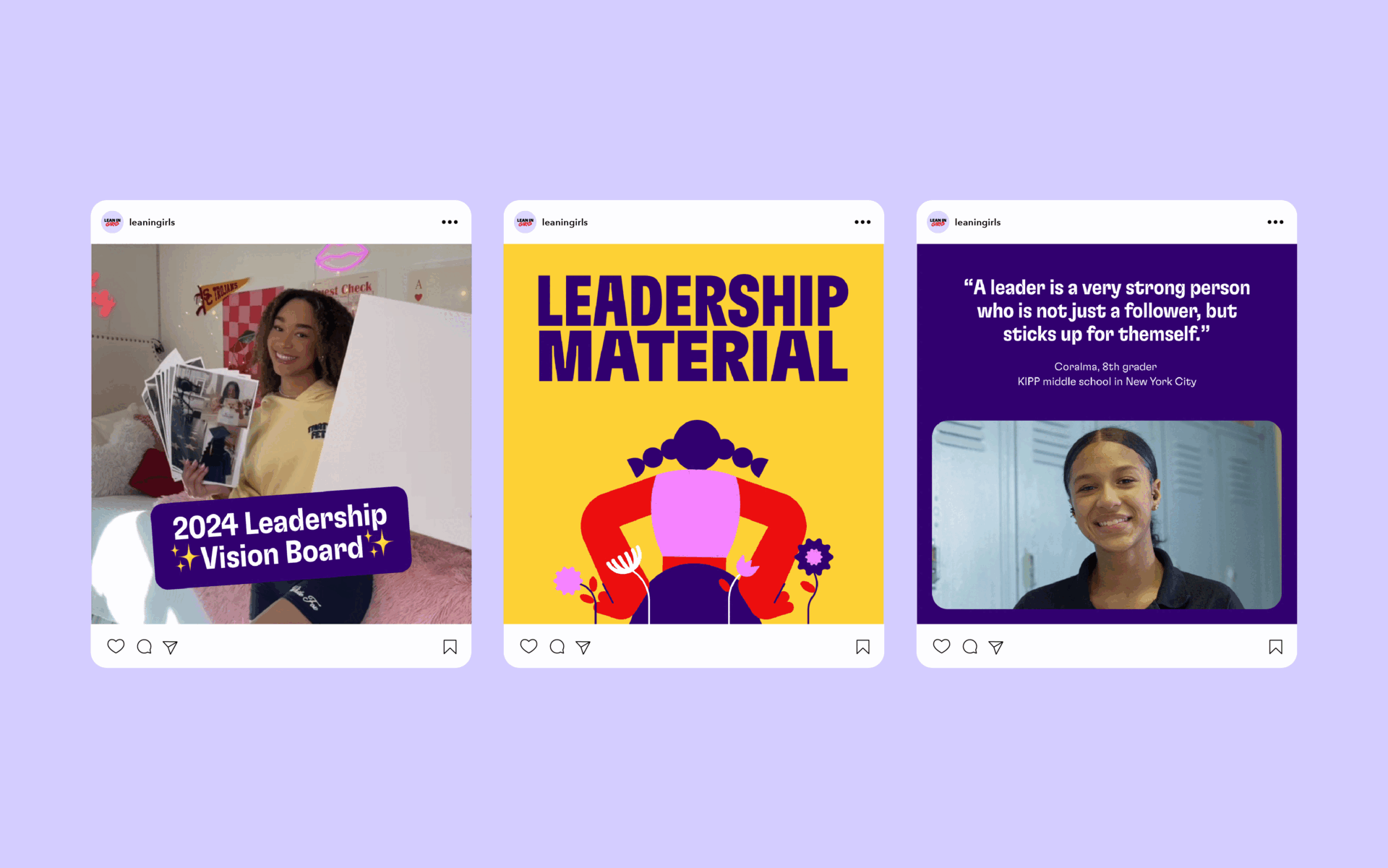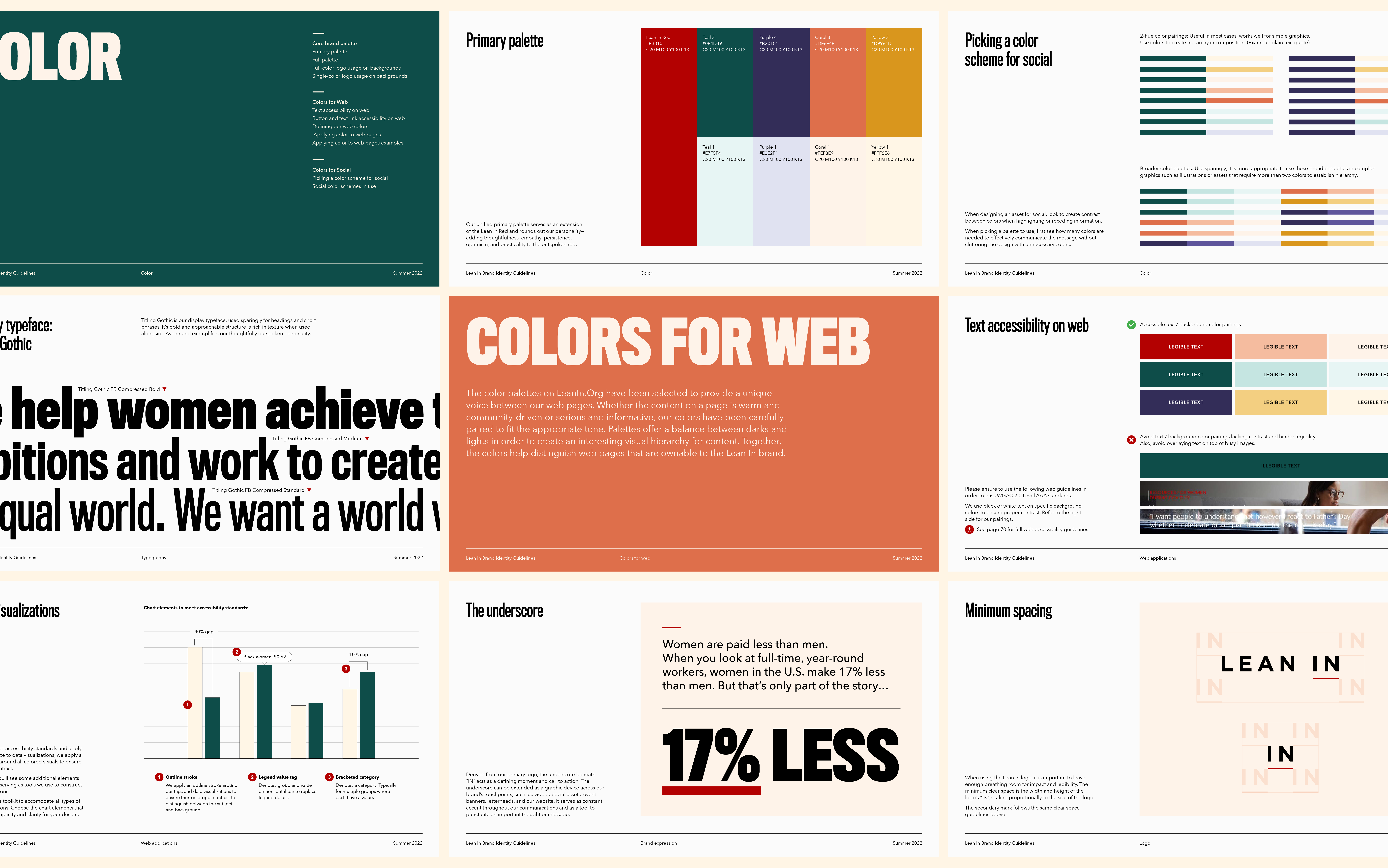 Drawing on insights from stakeholder interviews and cross-functional workshops, we introduced a clarified brand purpose and values to better align with Lean In’s mission and audience, alongside new display and body typefaces, an expanded color palette, refined layouts, and illustrations.