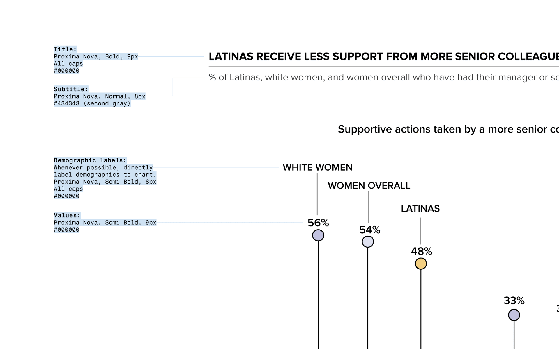 Design Systems, Data VisualizationDeveloped a comprehensive design system to unify Lean In’s four State of… reports. The system provides clear guidance on data visualizations, color application, and typography, while establishing a component kit that enables research, writing, and design teams to collaborate using a shared visual language.